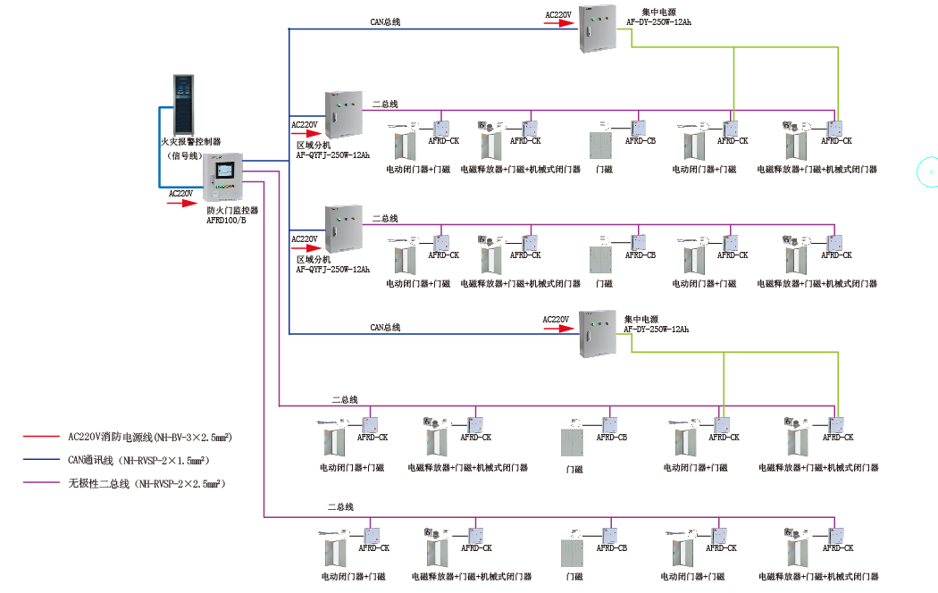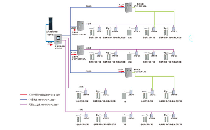 AFRD防火門監控系統集中控制其各終端設備即電動閉門器、電磁釋放器的工作狀態,實時監測疏散通道防火門的開啟、關閉及故障狀態,顯示終端設備開路、短路等故障信號。系統采用消防二總線將具有通信功能的監控模塊相互連接起來,當終端設備發生短路、斷路等故障時,防火門監控器能發出報警信號,能指示報警部位并保存報警信息,保障了電氣安全的可靠性。