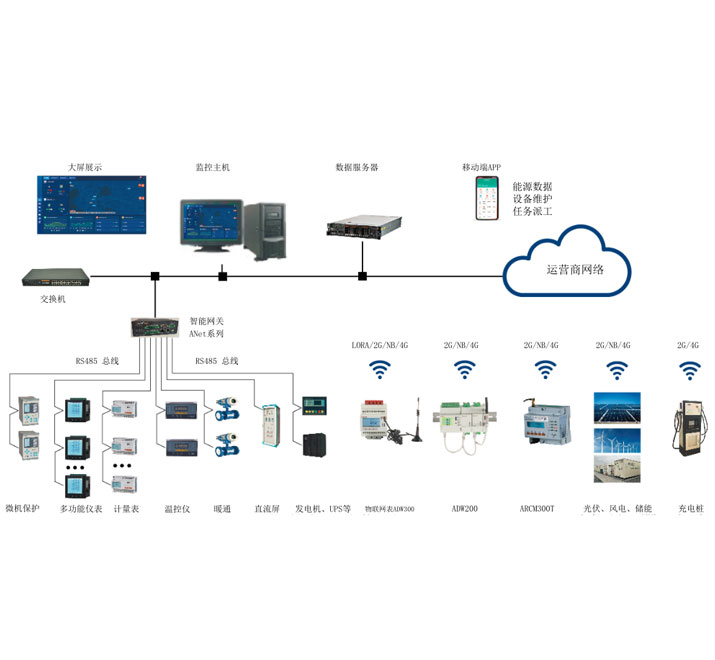 現(xiàn)場(chǎng)感知層設(shè)備用于感知電、水、冷熱量等能源數(shù)據(jù),并上傳至智能網(wǎng)關(guān)或者通過4G/NB-IOT等方式直接上傳數(shù)據(jù)服務(wù)器。