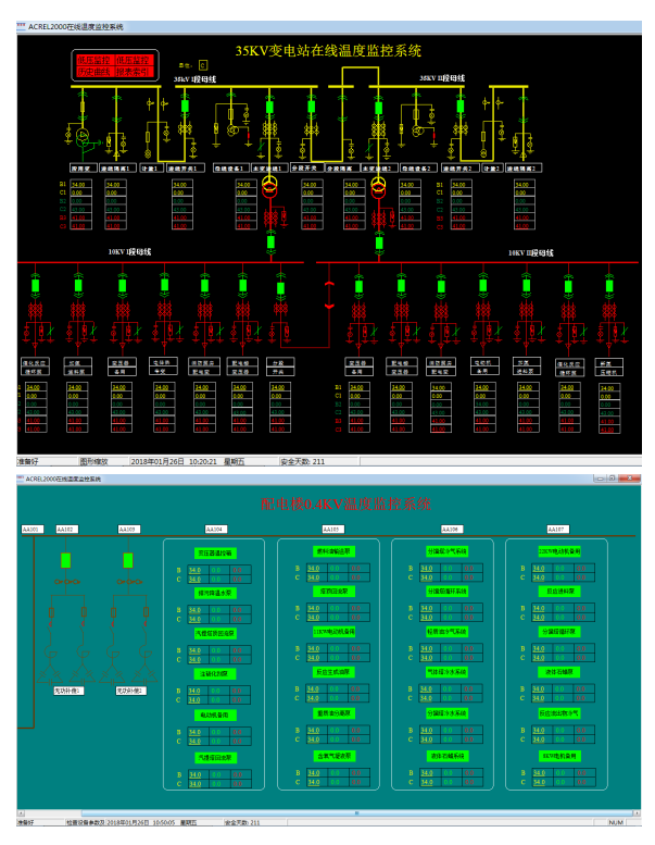 安科瑞Acrel-2000T無線測溫系統人機界面友好,能夠以配電一次圖的形式直觀顯示各測溫節點的溫度數據,及有關故障、告警等信號。