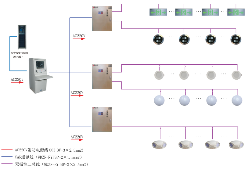 集中電源集中控制型消防應急照明和疏散指示系統(tǒng)采用應急照明控制器(主機)+集中電源+燈具三層結(jié)構(gòu)組網(wǎng)模式,適用范圍廣,滿足各種環(huán)境的現(xiàn)場,便于區(qū)域化管理,燈具與分配電裝置之間采用二總線通訊,監(jiān)控器與集中電源之間采用CAN總線通訊,滿足了通訊實時性高的要求。