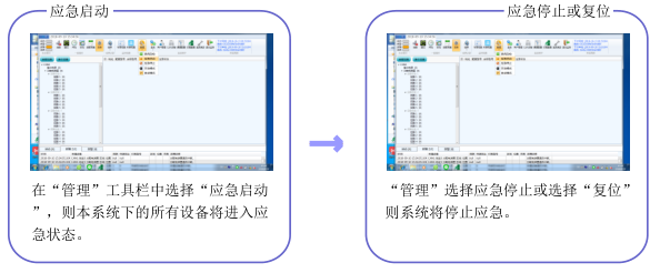 正常情況下本系統(tǒng)與消防火災報警主機通過開關量輸入或RS232通訊方式保持相連,有火災報警情況時,本系統(tǒng)將自動啟動應急狀態(tài)(標志燈常亮、照明燈亮起)。若手動模擬啟動應急與復位參考如下操作步驟: