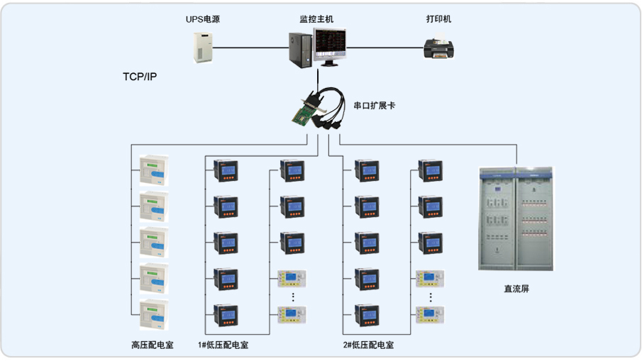 整個系統(tǒng)采用分布式結構,高壓配電室、低壓配電室1#、低壓配電室2#內現(xiàn)場設備均采用RS485總線直接接入監(jiān)控主機擴展卡的串口。對于每個回路采用ACR多功能儀表,共126個回路;站控層應用國內知名的聯(lián)想商用計算機作為監(jiān)控主機,同時設有用于報表打印輸出的打印機;防止異常斷電而引發(fā)的數(shù)據(jù)丟失的UPS設備。監(jiān)控軟件平臺采用單機版Acrel-3000型電能管理系統(tǒng)。Acrel-3000型電能管理系統(tǒng)預留了擴展接口,可方便進行擴展。