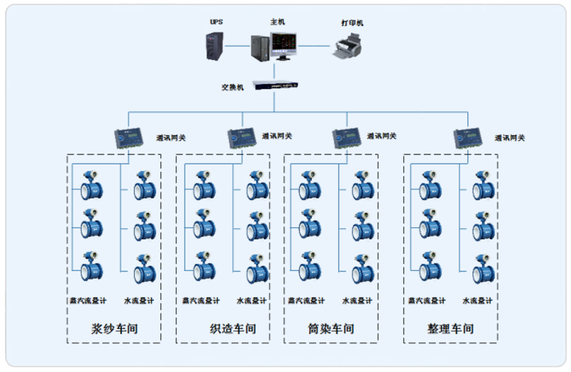 系統(tǒng)采用Acrel-5000型能耗監(jiān)測系統(tǒng),整個(gè)系統(tǒng)采用網(wǎng)絡(luò)分布式結(jié)構(gòu),監(jiān)控主機(jī)位于現(xiàn)場數(shù)據(jù)機(jī)房中,現(xiàn)場主要監(jiān)測儀表為水、蒸汽的流量計(jì),位于現(xiàn)場4個(gè)生產(chǎn)車間內(nèi)。該項(xiàng)目實(shí)現(xiàn)了常州強(qiáng)聲紡織有限公司內(nèi)能源的智能管理。所有監(jiān)控設(shè)備均通過屏蔽雙絞線至各自車間內(nèi)的通訊管理機(jī),再通過光電轉(zhuǎn)換器經(jīng)過光纖將數(shù)據(jù)傳輸至數(shù)據(jù)中心,從而實(shí)現(xiàn)遠(yuǎn)程監(jiān)控。