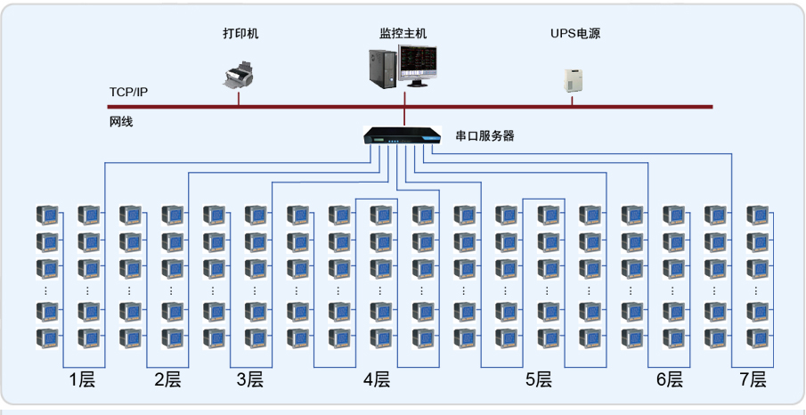 本項(xiàng)目電力監(jiān)控系統(tǒng)采用分布式結(jié)構(gòu),為現(xiàn)場(chǎng)層、通訊層和后臺(tái)監(jiān)控層。現(xiàn)場(chǎng)層指分布于于各樓層動(dòng)力箱及地下配電室內(nèi)的安科瑞系列儀表,通訊層包括NPORT5630-16串口服務(wù)器、網(wǎng)絡(luò)交換機(jī)等,后臺(tái)監(jiān)控層包括計(jì)算機(jī)、打印 機(jī)、UPS電源等。通訊層及后臺(tái)監(jiān)控層都位于地下監(jiān)控室內(nèi)。現(xiàn)場(chǎng)所有安科瑞系列儀表通過屏蔽雙絞線拉到地下監(jiān)控室內(nèi),與串口服務(wù)器相連,經(jīng)交換機(jī)與計(jì)算機(jī)連接,實(shí)現(xiàn)數(shù)據(jù)采集。
