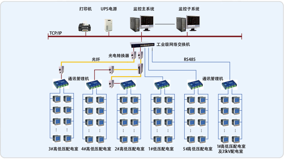 浦江雙輝大廈監(jiān)控部分有1個35kV配電室, 1#、2#、3#、4#、5#5個配電室分10kV高壓和0.4kV低壓。35kV配電室有高壓電力儀表、綜保和2臺變壓器溫控儀,另外5個配電室有10kV高壓電力儀表和綜保,0.4kV低壓部分有電力儀表和22臺變壓器溫控儀。35kV和1#配電室分布在A棟的B2層,2#配電室分布在B棟的B2層,3#配電室分布在A棟的33樓,4#配電室分布在B棟的33樓,5#配電室分布在A棟的B4層。針對浦江雙輝大廈的實際情況,通過計算機(jī)和通訊網(wǎng)絡(luò),將分散的配電所的現(xiàn)場設(shè)備連接為一個有機(jī)的整體,實現(xiàn)電網(wǎng)設(shè)備運(yùn)行的遠(yuǎn)程監(jiān)控和集中管理。