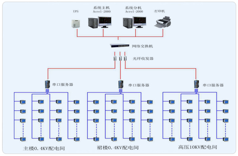 系統采用Acrel-2000型電力監(jiān)控系統,整個系統采用網絡分布式結構,包含主樓0.4KV低壓配電室,裙樓0.4KV低壓配電室,10KV高壓配電室三個區(qū)域,3個數據采集箱。監(jiān)控主機位于主樓地下一層的辦公室,監(jiān)控分機位于主樓一層的消控中心,所有配電回路均配備安科瑞電力儀表PZ系列。該項目實現了福州郵政廣場2棟樓內電力系統的智能管理。所有監(jiān)控設備均通過屏蔽雙絞線至各自配電室內的串口服務器,再通過光電轉換器經過光纖將數據傳輸至主樓地下一層的辦公室,從而實現遠程監(jiān)控。