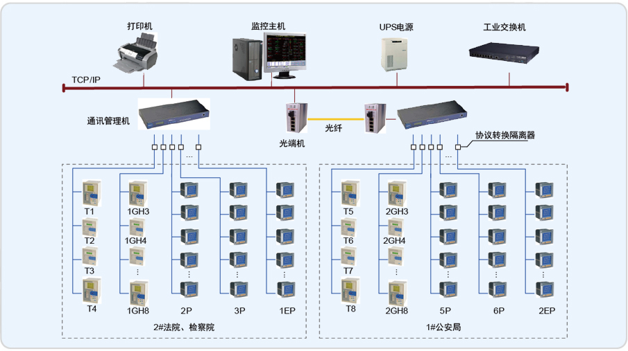 該項目有1#(公安局)、2#(法院、檢察院)兩個變配電室,室內的配電柜中安裝了安科瑞332塊PZ系列可編程智能電測表。為了能夠實現電力參數實時遙測、電能計量、電能報表等功能,系統采用Acrel-3000電能管理軟件,做到集中管理、集中控制,省去了值班人員現場抄表的煩瑣,具有投資少、簡明實用、便于智能管理等優點。
