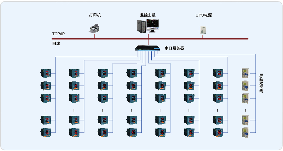 整個系統采用分布式結構,網球中心整個配電系統分為高低壓兩個部分,分別位于高壓變電所及低壓變電所,電力監控系統位于配電室旁邊的電力監控值班室。其中高壓配電室共計5個回路,分別為10KV進線1、10KV進線2、1#變壓器出線、2#變壓器出線及聯絡;低壓變電所共計145個回路,分別采用ACR220E及ACR220ELH,其中ACR220ELH安裝于低壓進線及發電機進線中。本系統網球中心電力監控數據均通過奧體中心內部局域網,將數據通過Modbus TCP的方式上傳至奧體中心數據中心,同時在廣州市10樓設置電力監控系統工作站,數據通過網絡公司局域網,通過廣東省104規約傳輸至調度中心。
