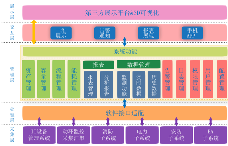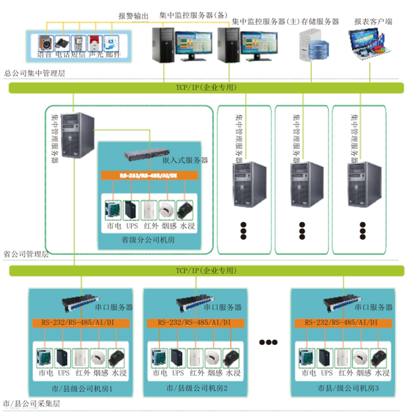 基礎設施集中監(jiān)控采用一體化監(jiān)控采集系統(tǒng)(運行在嵌入式服務器上),系統(tǒng)主要功能有: