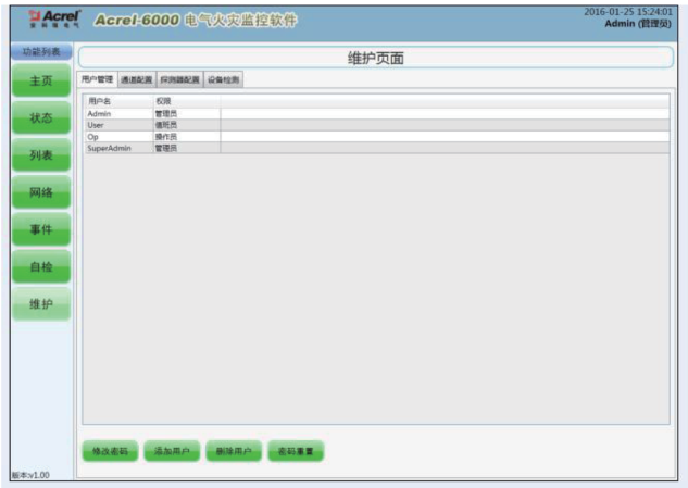 該界面可添加新的“操作員”和“值班員”權限的新用戶,也可刪除這兩個級別的現有用戶,該管理功能只有“超級管理員”和“管理員”可進行操作。